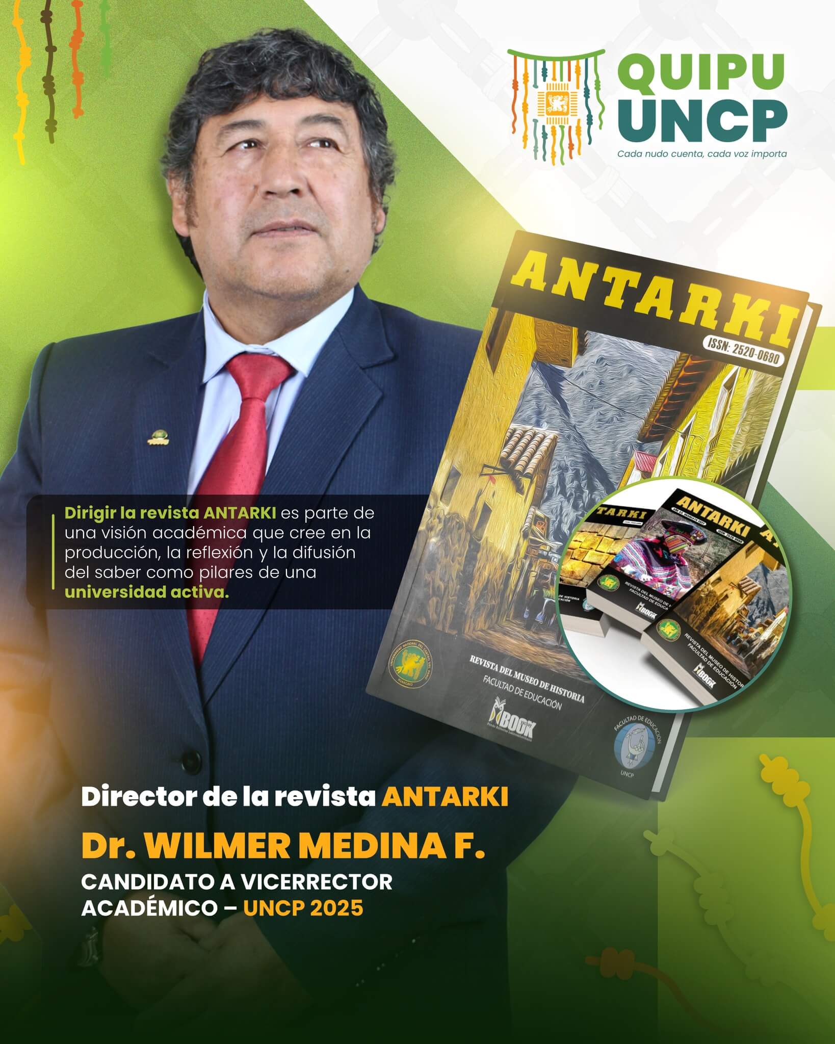 Docente investigador con doctorado en Ciencias de la Educación. Es Director de la Revista ANTAKI‑UNCP y subdirector académico de Estudios Generales desde 2017 .